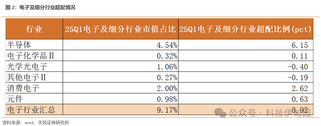 25Q1 电子行业大幅超配,半导体、消费电子细分行业表现较为显著。电子行业整体/半导体/电子化学品/光学光电子/其他电子/消费电子/元件 25Q1 末市值占比为9.17%/4.54%/0.32%/1.06%/0.27%/2%/0.98% , 对 应 超 配 比 例 约 为 8.92/6.15/0.11/-0.4/0.19/2.62/0.63pct。