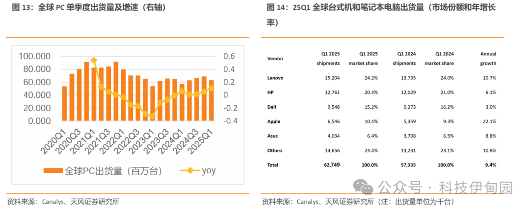 全球PC市场延续正增长趋势,受关税及AI PC渗透影响增速显著抬升。根据Canalys,2025Q1,PC出货量为62.7百万台,yoy+9.62%,相比于2024Q4季度yoy+4.06%增速显著抬升。根据Counterpoint Research初步数据,2025年Q1全球PC出货量的增长主要受PC厂商赶在美国加征关税前加速出货,以及Windows 10终止支持背景下AI PC加速普及的推动。但这一增长可能难以持续,预计库存水平将在未来数周趋于稳定。美国关税政策或将抑制2025年的增长势头。