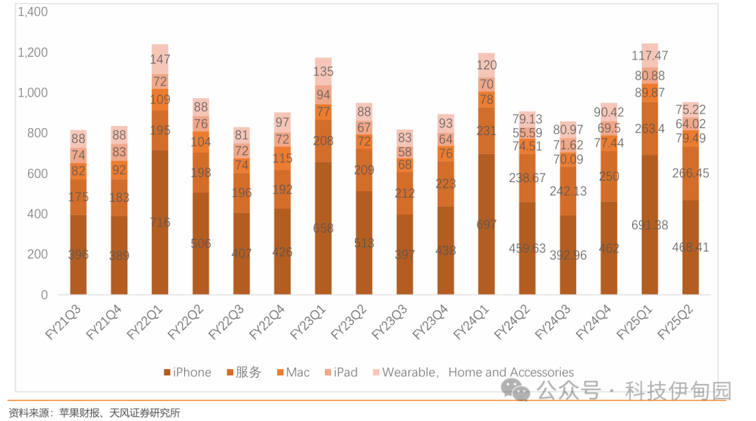 FY25Q1苹果公司营收和净利均保持了同比5%的增长,Mac、ipad及服务收入增速好于整体。截至2025年3月29日的2025财年第二财季,苹果公司第二财季净营收为953.59亿美元,与去年同期的907.53亿美元相比增长5%;净利润为247.80亿美元,与去年同期的236.36亿美元相比增长5%。来自于iPhone的营收为468.41亿美元,同比+ 1.9%。来自于Mac的营收为79.49亿美元同比+7%;来自于iPad的营收为64.02亿美元,同比+15%;来自于可穿戴设备、家居设备和配件的营收为75.22亿美元,同比-5%;来自于服务的营收为266.45亿美元,同比+12%。苹果的服务部门包括iCloud订阅、Apple Music和Apple TV+等服务、保修和搜索许可协议带来的收入。分地区来看,除了中国区营收同比下滑之外,其他区域均保持了增长。根据苹果CEO库克,剔除外汇变化影响,其实苹果第二财季在中国区的销售额同比是基本持平的。此外,相比截止12月的季度,苹果在大中华区的销量环比还有所改善。