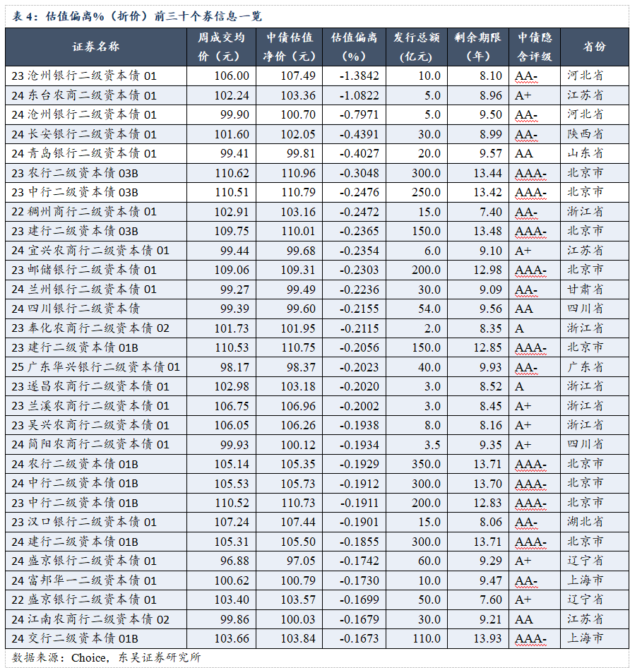 折价个券方面,折价率前三的个券为23沧州银行二级资本债01(-1.3842%)、24东台农商二级资本债01(-1.0822%)、24沧州银行二级资本债01(-0.7971 %),其余折价率均在-0.45%以内。中债隐含评级以AAA-、AA-、A+评级为主,地域分布以北京市、浙江省、江苏省居多。