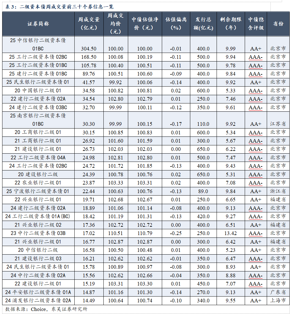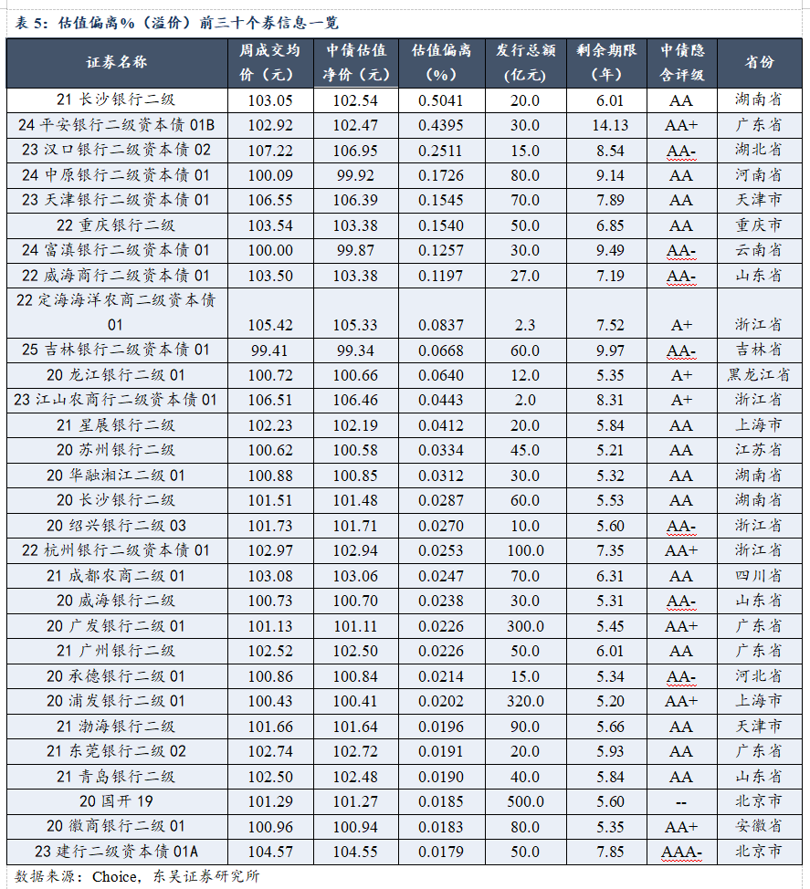 溢价个券方面,溢价率前三的个券为21长沙银行二级(0.5041%)、24平安银行二级资本债01B(0.4395%)、23汉口银行二级资本债02(0.2511%),其余溢价率均在0.20%以内。中债隐含评级以AA、AA-、AA+评级为主,地域分布以浙江省、广东省居多。