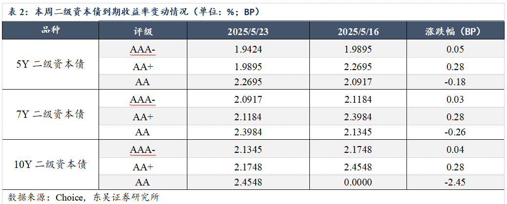 从到期收益率角度来看,截至5月23日,5Y二级资本债中评级AAA-、AA+、AA级到期收益率较上周涨跌幅分别为:0.05BP、0.28BP、-0.18BP;7Y二级资本债中评级AAA-、AA+、AA级到期收益率较上周涨跌幅分别为:0.03BP、0.28BP、-0.26BP;10Y二级资本债中评级AAA-、AA+、AA级到期收益率较上周涨跌幅分别为:0.04BP、0.28BP、-2.45BP。