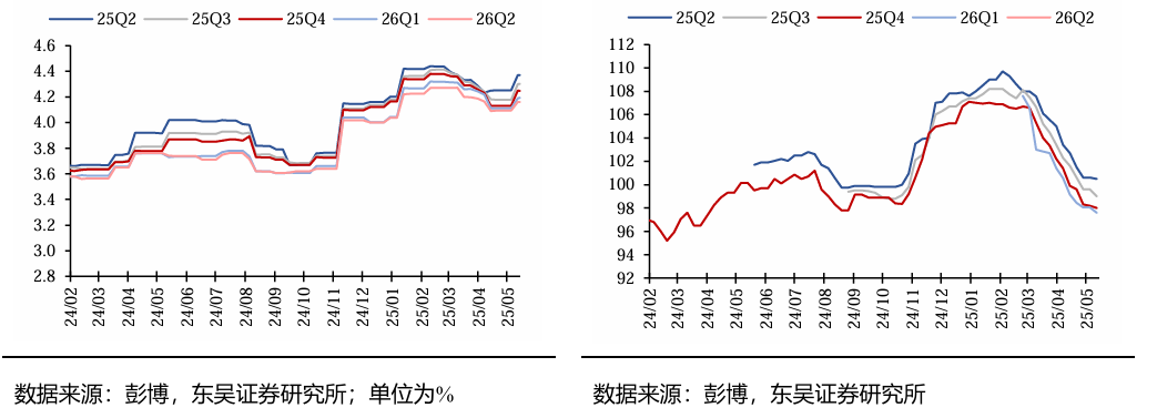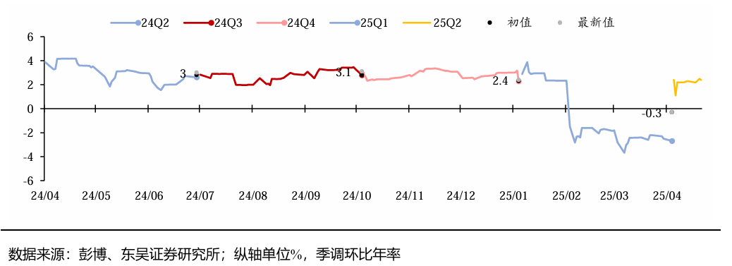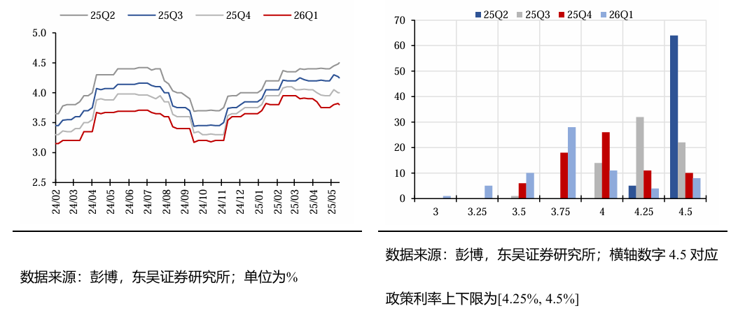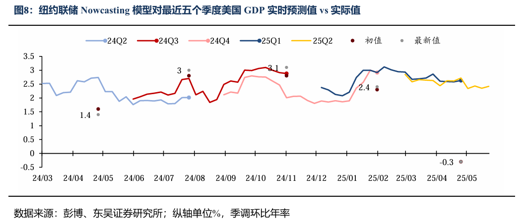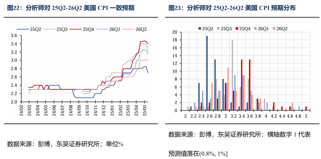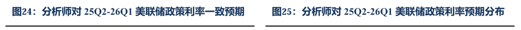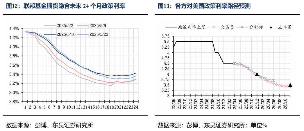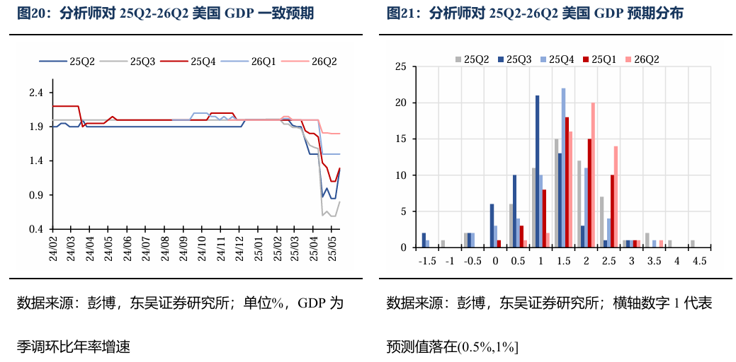 海外经济:中美关税协定后,分析师和美联储模型上调25Q2美国GDP增长预期。景气指标方面,美国4月咨商会经济领先指标环比-1%,预期-0.9%,前值-0.7%,成分指标中消费者预期、标普500指数、PMI新订单指数等是主要拖累。美国5月标普全球制造业PMI初值52.3,预期49.9,前值50.2;服务业PMI录得52.3,预期51,前值50.8。增长方面,分析师小幅上修今年美国增长预期。①模型:截至5月16日,亚特兰大联储GDPNow模型对25Q2美国GDP最新预测值为+2.4%;截至5月23日,纽约联储Nowcast模型对25Q2美国GDP预测值为+2.43%。②分析师:根据彭博在5月16-21日对86名分析师的调查问卷,当前分析师一致预期25Q2-25Q4美国GDP季环比年率增速分别为1.3→0.8→1.3%,均较上月预测值小幅上修;预期未来1年美国经济陷入衰退概率40%,较前值45%小幅下修。通胀方面,分析师小幅下修未来几个季度通胀预期。①分析师:最新分析师一致预期25Q2-26Q1美国CPI同比增速分别为2.6→3.2→3.4→3.1%,PCE同比增速分别为2.5→3.0→3.1→2.9%,其中,对25Q2-25Q4的CPI和PCE预测值下修0.1%-0.3%不等。②交易员:最新通胀掉期显示,交易员预期5-6月CPI同比分别为+2.48%、+2.92%,即预期通胀从5月开始将加速反弹。货币政策方面,分析师维持首次降息在2025Q3的预测。①模型:参考分析师对失业率与通胀率的最新预测,我们的泰勒规则指引25Q2-25Q4美联储政策利率上限分别为4.18→4.68→4.71%。②分析师:最新分析师一致预期25Q2-25Q4美联储政策利率上限分别为4.50→4.25→4.00%,即预期下一次降息在25Q3。从分布来看,预测25Q2降息0次、1次的分数分别为64、5人。③交易员:最新联邦基金期货模型显示,交易员预期2025年9月降息概率为72.6%,到12月累计降息1.92次/48bps,与分析师对年内降息节奏和幅度基本一致。