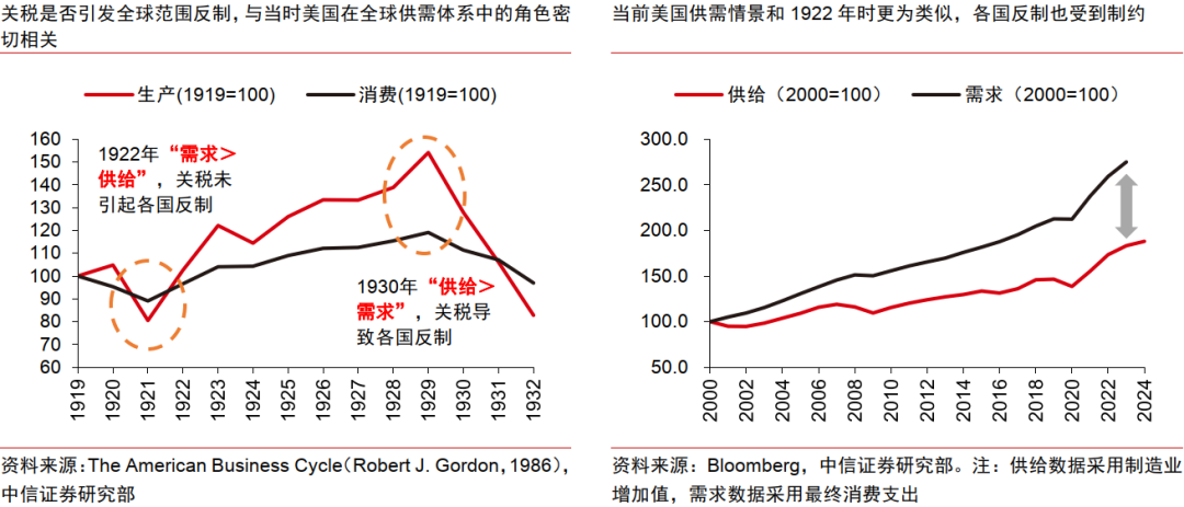 从美国国内看,1930年贸易冲突发生于大萧条初期,关税具有“被迫性”,社会支持更强;而当前美国国内对关税分歧更大,中期选举约束下,一旦关税引发经济反噬,或有更多政策纠偏。从国际环境看,当前全球供需依赖度更深、价值链耦合度更高,货币体系也更为稳定。因此,我们判断本轮贸易冲突不会走向失控。