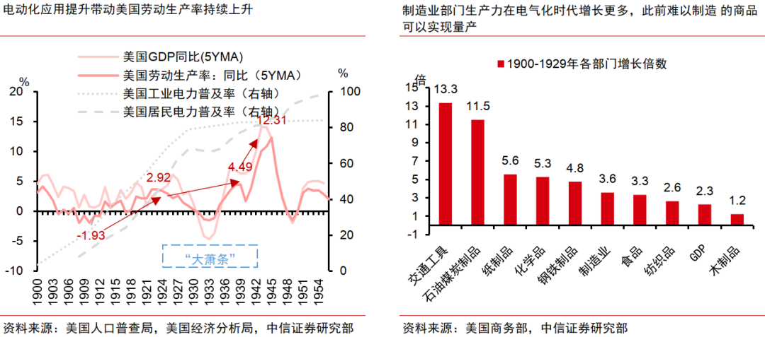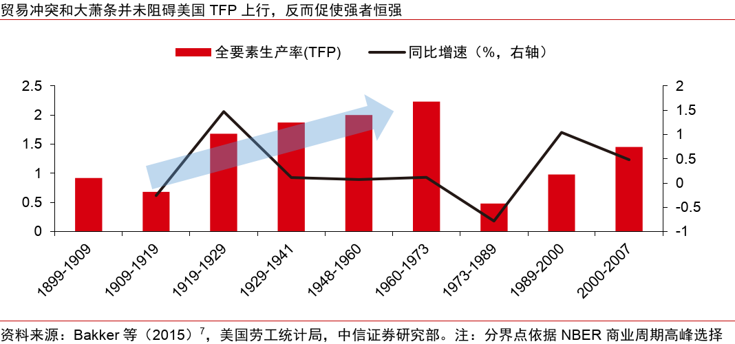 产业地位方面,全球贸易冲突难以改变后发国家的崛起趋势,我国的产业升级仍将持续提速。上世纪三十年代全球贸易与金融秩序的混乱,未能减缓美国工业崛起的脚步,制造业技术进步支撑美国TFP持续上行。着眼当下,我们认为本轮全球产业链与贸易格局的重塑也难以削弱中国制造业的整体竞争力,外部冲击或将加速中国产业升级,消费品和部分高端制造品的国产替代值得关注。
