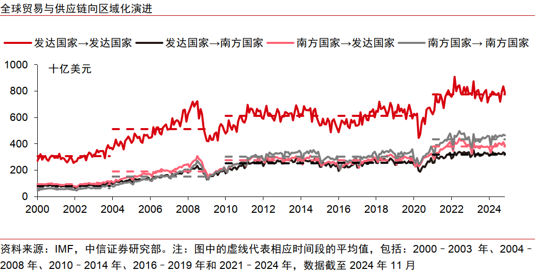 产业格局方面,全球产业链长期上或逐步演变为以中美各自主导的两套体系,以“十五五”规划为契机,我国内需的提振也将增强与其他国家经贸合作的落脚点。中短期来看,即便美国推动供应链向第三方国家转移,也难以完全摆脱对中国的依赖,企业出海与中间品出口仍是中国维系全球产业链参与度的关键抓手。长期来看,全球产业链或将逐步演变为以中美为核心各自主导的两套体系。产业链重构过程中,我国或将以“十五五”规划为契机提振内需,从而增强与其他国家经贸合作的落脚点。