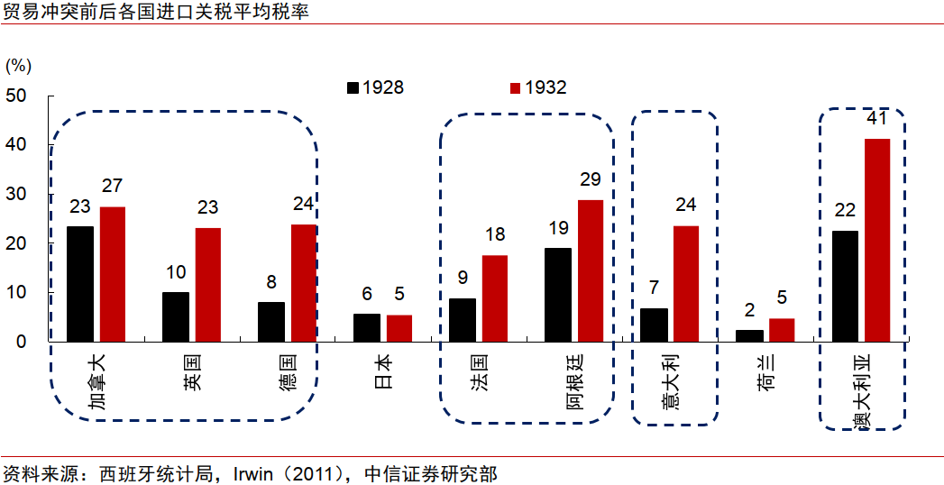 ▍上世纪三十年代,美国在经济失衡与大萧条冲击下全面提高关税水平,全球贸易冲突爆发并最终走向失控。