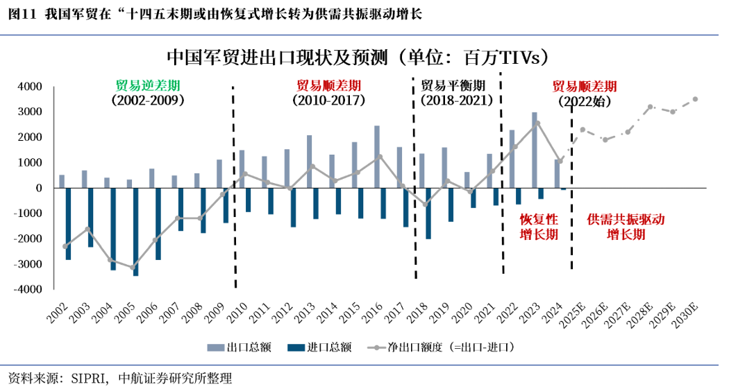 我们判断,在地缘政治事件频发、新型战争形态出现的背景下,全球军贸市场整体将持续快速增长。对于我国而言,随着我国自身产品竞争优势与生产能力的不断提升,之前国内产能倾向于解决内需的情况有望逐步改变,叠加部分国家的军贸出口萎缩导致其下游客户需求存在缺口、全球战争形态的演变、我国政策出台引导军贸出口合规发展等因素,我国军贸短期内有望持续增长,并在“十四五”末期由恢复式增长向供需共振驱动增长转变。