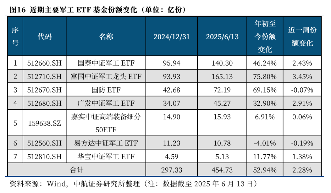本周,军工板块(申万)成交额为2444.39亿元(+22.64%);占中证全指成交额比例为3.73%,同比下降0.56pts。主要军工ETF基金份额环比上周上涨2.28%。