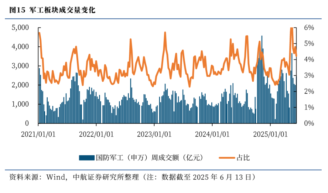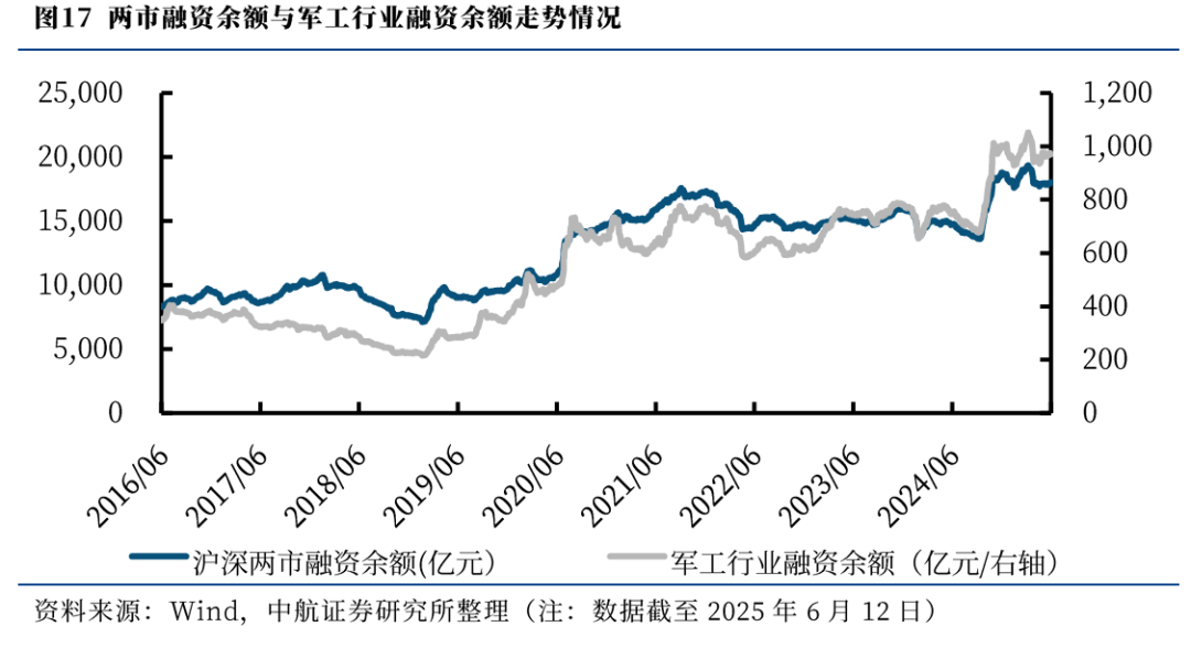 截至2025年6月12日,军工行业的融资余额合计970.57亿元,比上周环比下降0.28,占两市融资余额比例为5.38%。