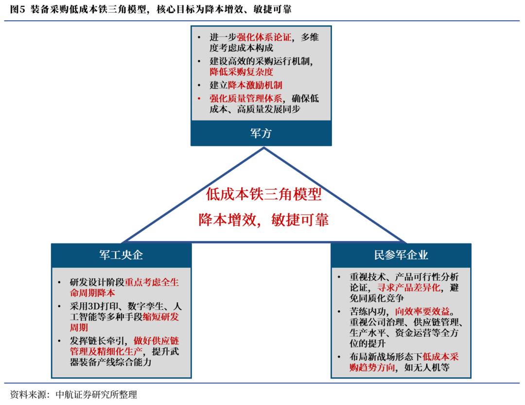 武器装备体系的成本控制需要各类主体积极参与其中,最终用户军方、产业链链主军工央企、配套供应商民参军企业结合自身的特点和优势,在低成本中发挥作用,共同构成低成本化铁三角模型,并追求建立降本增效、敏捷可靠武器装备体系的一致目标。