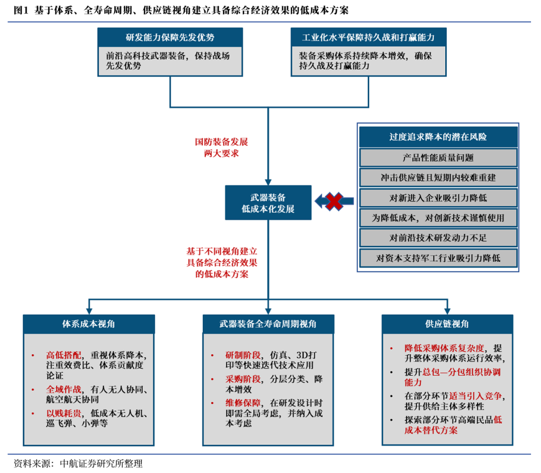 高精尖武器装备保障战场先发优势、高水平国防工业能力保障持久战及打赢能力,这是国防装备发展的两大要求。如何在有限资源下,应对新时代战场的变化,寻求低成本、高质量发展的装备体系成为军工行业核心课题。