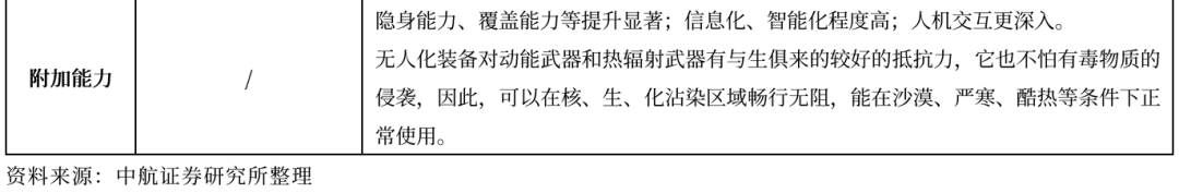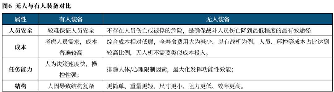 无人化装备区别于有人装备,类似无人化生产,有显著的优越性与劣势。无人化生产相较于有人生产具有安全性、经济性、效率性、耐受性等多重优势。类似的,无人化装备在人员安全、成本、任务能力、附加能力有具备类似显著的优势。