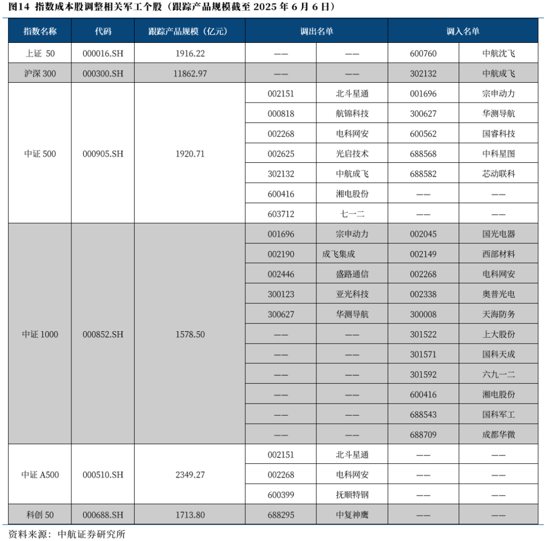 近期部分宽基指数公布定期调整结果,多支军工行业个股被调入。其中,中航成飞被调入沪深300指数;宗申动力、国睿科技、国盾量子、中科星图等被调入中证500指数;西部材料、奥普光电、天海防务、上大股份、国科天成、六九一二、国科军工等被调入中证1000指数;中航沈飞被调入上证50指数。