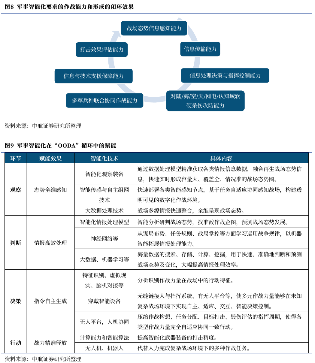 对于我国而言,一方面国内无人装备、反无人系统、电子对抗等新质新域作战方式在国内虽然处于早期发展阶段,但应用确定性相对较强,有望成为军工板块在未来中长期持续高景气发展的新驱动力;而军事智能化则成为抢占先机、主导战场的又一关键领域,从作战角度讲,智能化涉及情报处理、辅助决策、火力打击、网络攻防、电子对抗、综合保障等各个作战环节和领域,包括无人作战系统本身也需要智能技术来提升其自主能力,新的战争形态催生产业应用和需求。