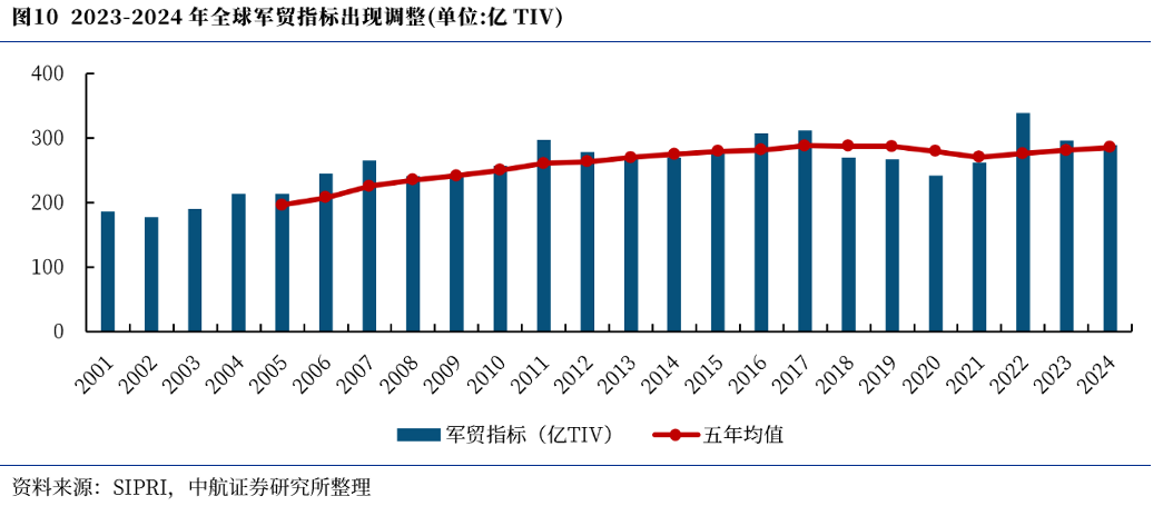 2024年,SIPRI全球军贸指标略有下降,但是军贸热度仍然维持在高位,根据SIPRI数据,单年度看,全球军贸指标在2022年高速增长,创下21世纪以来新高,但由于军贸订单签订与交付存在时间差,以及近年来二手装备占比提升的影响,2023年全球军贸指标同比下降12.37%,2024年再次同比下降2.51%,而2020-2024年军贸指标的五年均值则依旧实现了同比1.56%的增长。基本符合历史上军贸指标存在周期性波动,但整体重心上行趋势不变的特点。