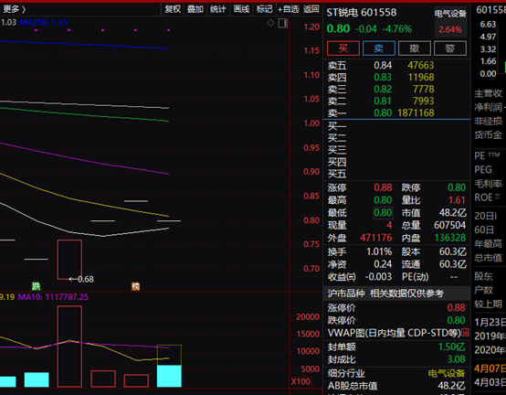 行情数据显示,截至今天上午收盘,ST锐电报0.80元,牢牢封死跌停,跌停板上封单高达近1.9亿股。