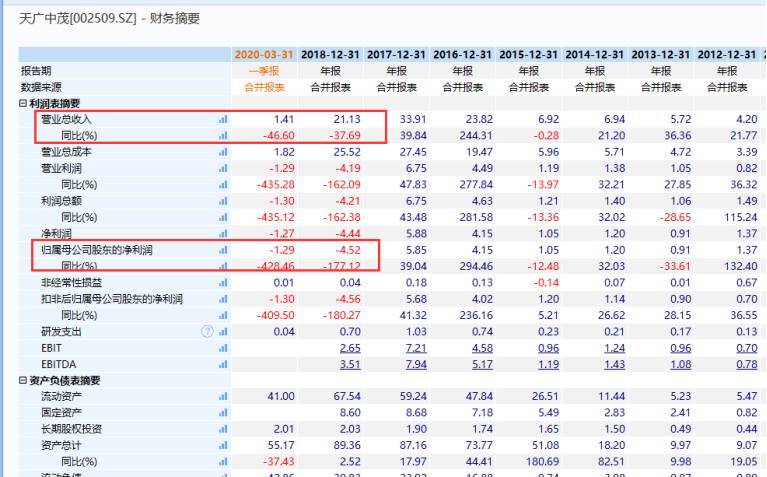 根据公开资料,天广中茂的业绩此前一些年份比较稳定,自2018年后开始显著恶化,营收和利润均开始下滑,当年年度营收同比下降37.69%,并出现4.52亿元的亏损。2020年一季度,公司再度亏损1.29亿元,但对于2019的正式年报,公司如今尚未披露。