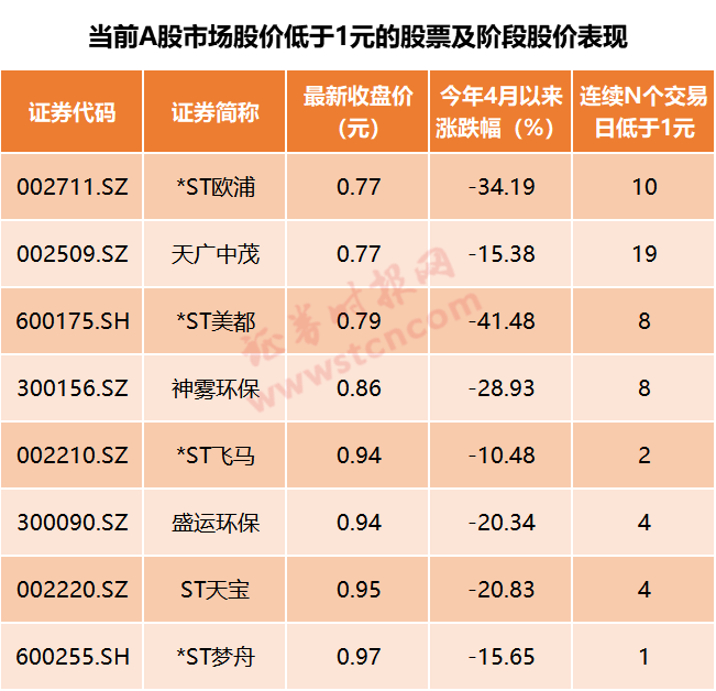 与此同时,另一家A股上市公司天广中茂(002509.SZ)5月8日则是连续第19个交易日收盘价低于面值,股价仅收报0.77元,即便下一个交易日涨停,也铁定将触及面值退市标准。