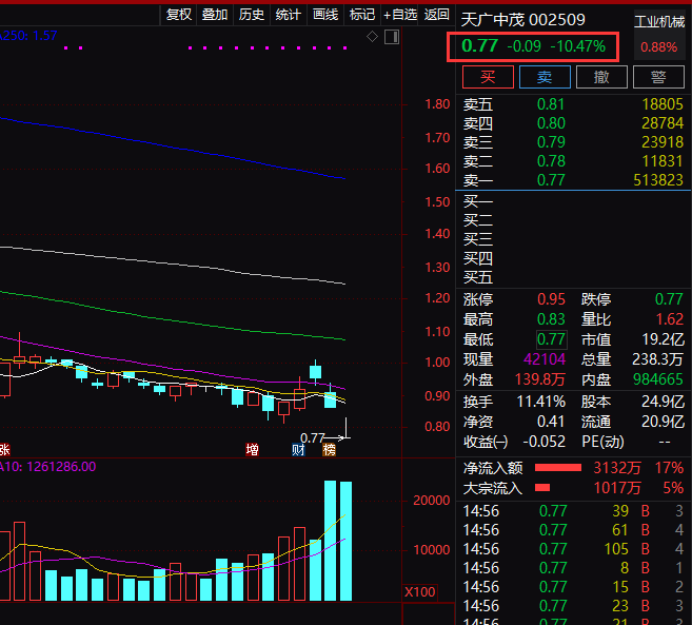 行情数据显示,天广中茂当日收盘也是牢牢封住跌停,收报0.77元,已连续第19个交易日低于1元面值,即便下一个交易日涨停,公司股价也无法回到1元以上,从而也将触及面值退市标准。