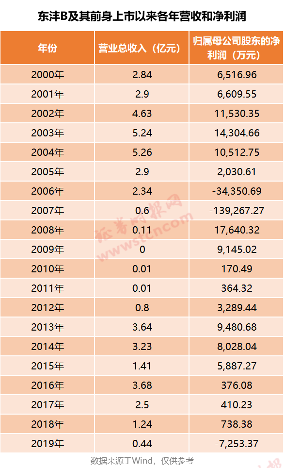 数据显示, 东沣B及其前身上市以来,其营收总体未有增长,甚至有所萎缩,最近几年东沣B净利润更是徘徊在微利和亏损之间,经营情况不佳。
