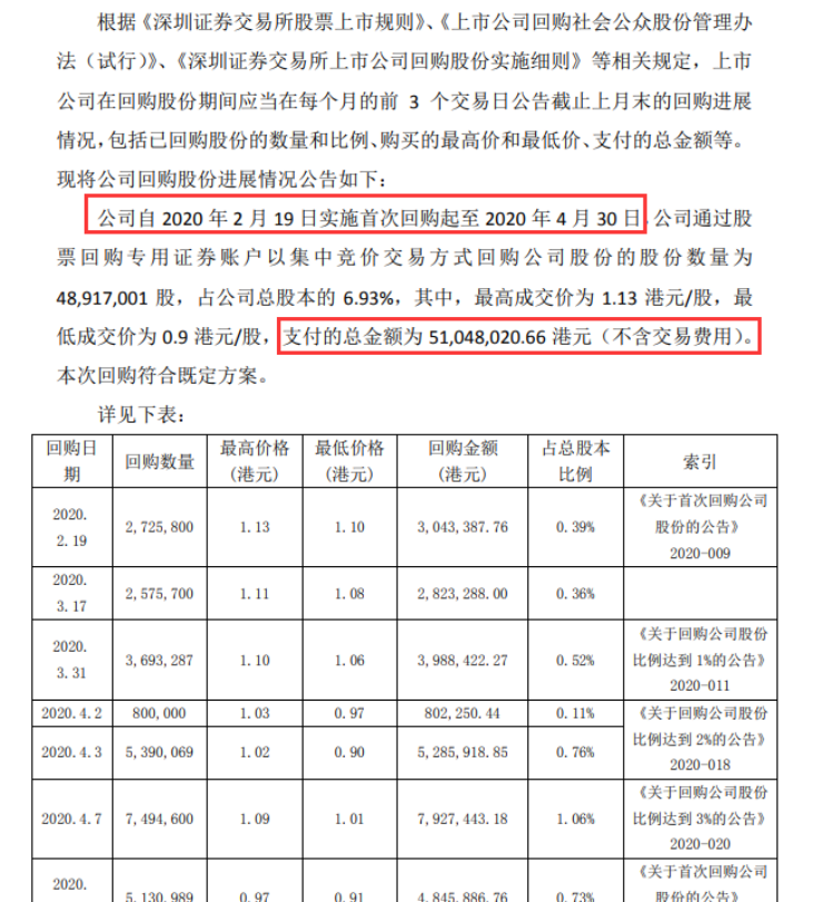 公告显示,东沣B自2020年2月19日实施首次回购起至2020年4月30日,通过股票回购专用证券账户以集中竞价交易方式回购公司股份的股份数量为48,917,001股,占公司总股本的6.93%,其中,最高成交价为1.13港元/股,最低成交价为0.9港元/股,支付的总金额约为5104.8万港元(不含交易费用)。