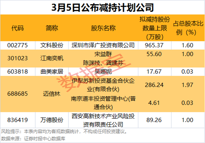 3月5日共有5家公司披露股东减持计划,拟减持股份比例居前的有迈信林、文科股份等。