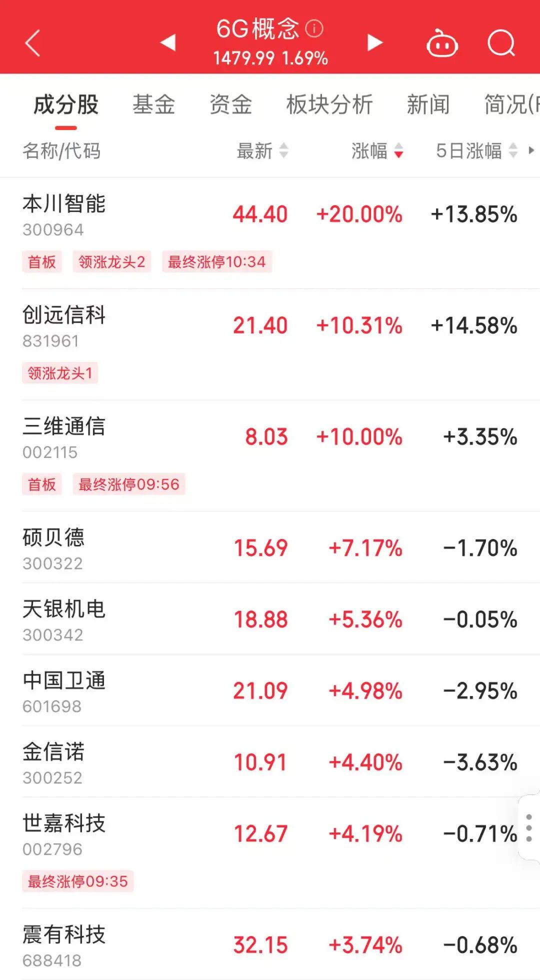 盘面上,6G、人形机器人、商业航天等相关概念涨幅居前,6G概念指数涨超1%,本川智能盘中触及“20cm”涨停,三维通信涨停。