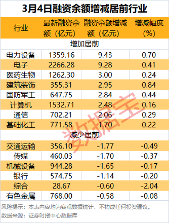 分行业统计,申万所属一级行业中,有16个行业融资余额增加,电力设备行业融资余额增加最多,较上一日增加9.43亿元;融资余额增加居前的行业还有电子、医药生物、建筑装饰等,融资余额分别增加9.28亿元、3.00亿元、2.95亿元。