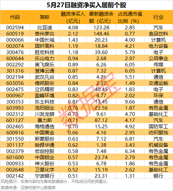 比亚迪融资净买入额居首,当日净买入4.08亿元;其次是贵州茅台、中国长城,融资净买入金额分别为2.12亿元、1.43亿元。融资净买入金额居前的还有国轩高科、胜宏科技、乐山电力等。