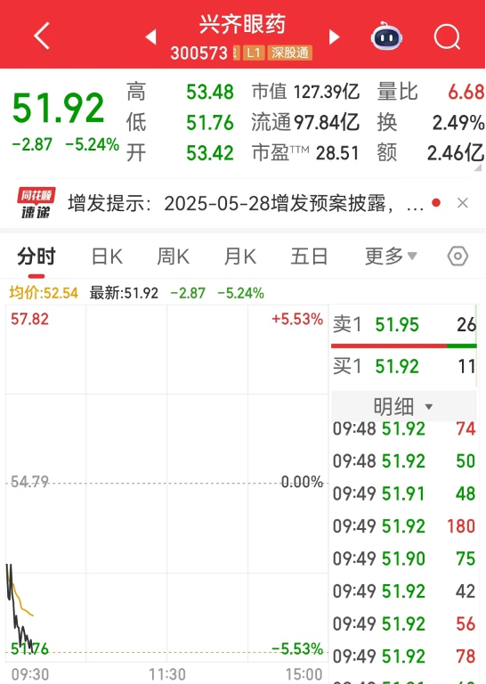 5月28日,共有中成股份、兴齐眼药两家公司公布非公开发行预案。从股价表现看,中成股份开盘涨停后被迅速打开,兴齐眼药小幅低开后震荡走弱。