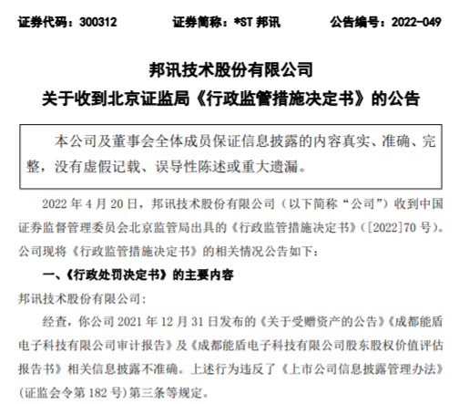 审计机构与*ST邦讯的意见不一致在此前就有迹可循。4月20日,*ST邦讯收到北京证监局出具的《行政监管措施决定书》显示,公司2021年12月31日发布《关于受赠资产的公告》《成都能盾审计报告》及《成都能盾股东股权价值评估报告书》的相关信息披露不准确,违反了《上市公司信息披露管理办法》的相关规定。