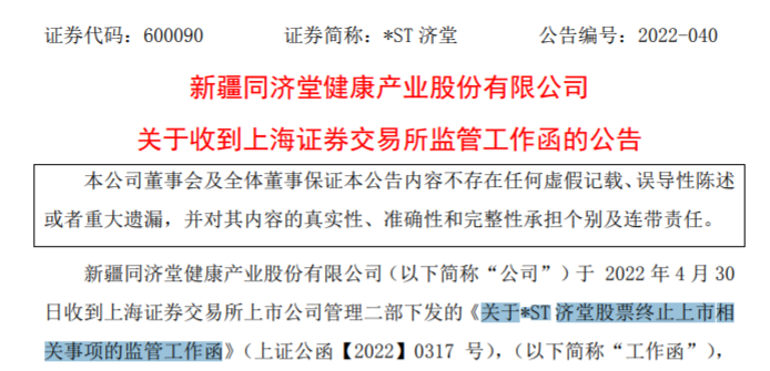 *ST济堂称,公司2020年财报被出具了无法表示意见的审计报告,触及退市新规的“财务类退市风险警示”情形。在此基础上,公司未在法定期限披露最近一年年报,将被上交所终止上市。
