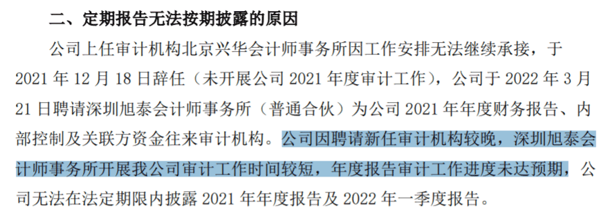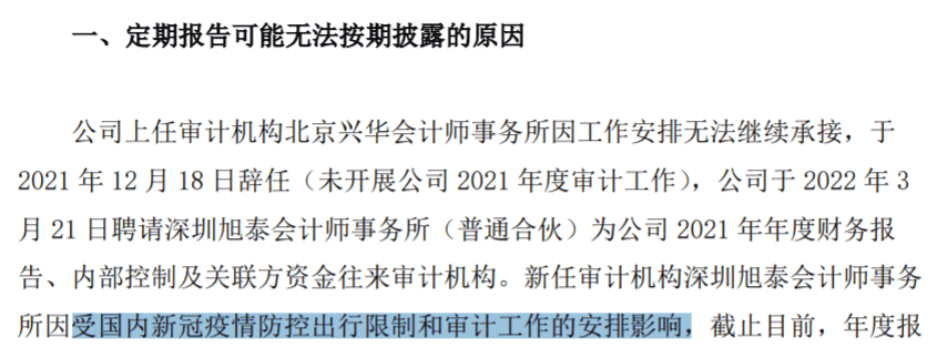 4月30日,ST辅仁在无法按期披露定期报告时,却未提及疫情影响,仅表示,聘请深圳旭泰为2021年度审计机构的时间较晚,其开展审计工作时间较短导致2021年度审计工作进度未达预期。