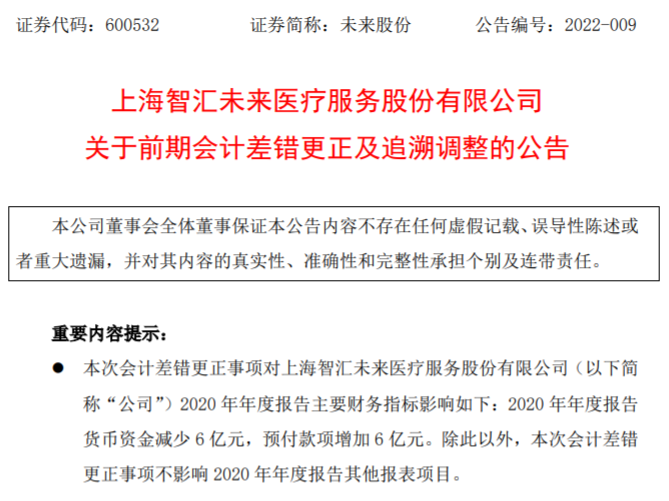 公司表示,在编制和配合审计2021年财报过程中,发现此前期间存在会计差错,应当按照相关规定追溯重述更正前期重要差错,导致2020年年报的货币资金减少6亿元、预付款项增加6亿元。