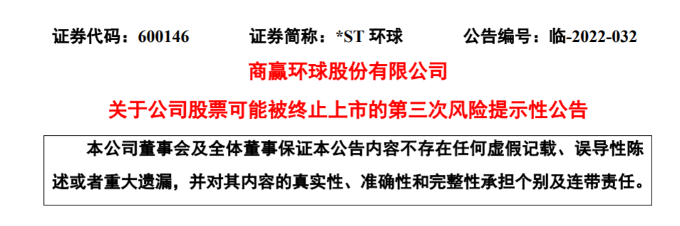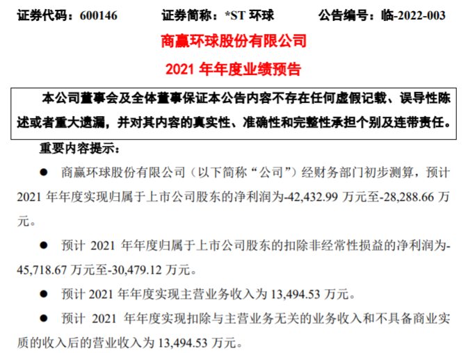 *ST环球同样表示受疫情影响,无法在法定期限披露2021年年报。不过,公司此前称,扣除与主营业务无关的业务收入和不具备商业实质的收入后,存在营业收入不足1亿元的风险,可能被终止上市。