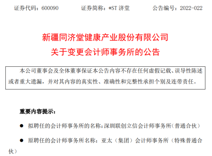*ST济堂2021年度审计机构深圳联创立信会计师事务所(普通合伙)(下称“联创立信”)出具情况说明称,公司与联创立信在4月5日签署审计业务约定书,距离法定报告日的间隔时间较短,结合*ST济堂年报审计流程和工作量,无法在4月30日前履行完审计程序。