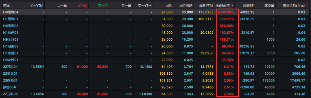 今天地产债表现抢眼,多只地产债强劲上涨,行情数据显示,今天涨幅居前的交易所债券中,包括多只地产债,比如H0阳城04涨幅甚至高达2500%,另有多只地产债涨幅超过100%。