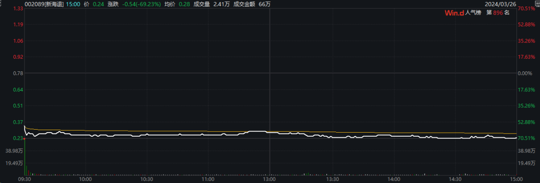 新海退(维权)(*ST新海)进入退市整理期首日,股价收盘重挫69.23%,盘中一度暴跌超过70%。