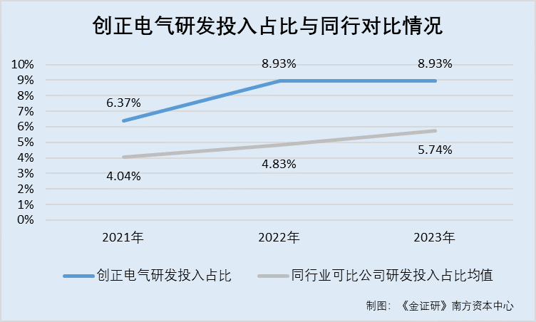 据签署于2024年6月19日的招股书,创正电气拟在北交所上市。2021-2023年,创正电气的研发投入金额分别为722.1万元、1,049.54万元、1,222.88万元,占营业收入的比例分别为6.37%、8.93%、8.93%。其中,创正电气的研发投入均为研发费用。