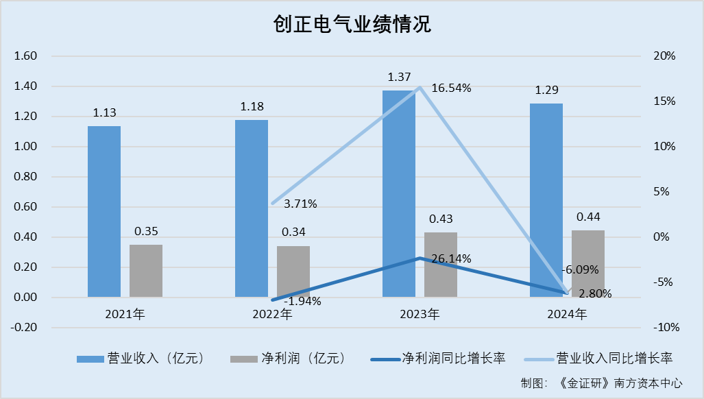 《金证研》南方资本中心测算,2022-2024年,创正电气营业收入的增速分别为3.71%、16.54%、-6.09%,净利润增速分别为-1.94%、26.14%、2.8%。