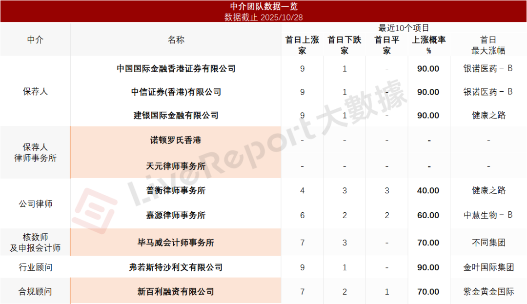 据LiveReport大数据统计,纳芯微中介团队共计10家,其中保荐人3家,近10家保荐项目数据表现优异;公司律师共计2家,综合项目数据表现不足。整体而言中介团队历史数据表现尚可。