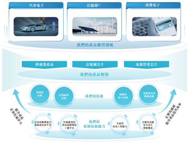 公司是中国领先的模拟芯片提供商。作为一家fabless公司,公司围绕(i)汽车电子(ii)泛能源及(iii)消费电子等应用领域,提供丰富、高性能、高可靠性的产品及解决方案,包括传感器产品、信号链芯片和电源管理芯片三大品类。