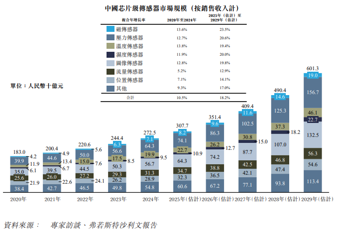 2024年,中国传感器市场规模达到人民币2,725亿元,预计中国传感器市场稳定增长,到2029年规模将达到人民币6,013亿元,2025年至2029年复合年增长率为18.2%