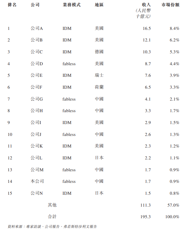 2024年,公司在中国模拟芯片市场排名第14位;在所有fabless公司中排名第6位;以及在中国公司中排名第5位。