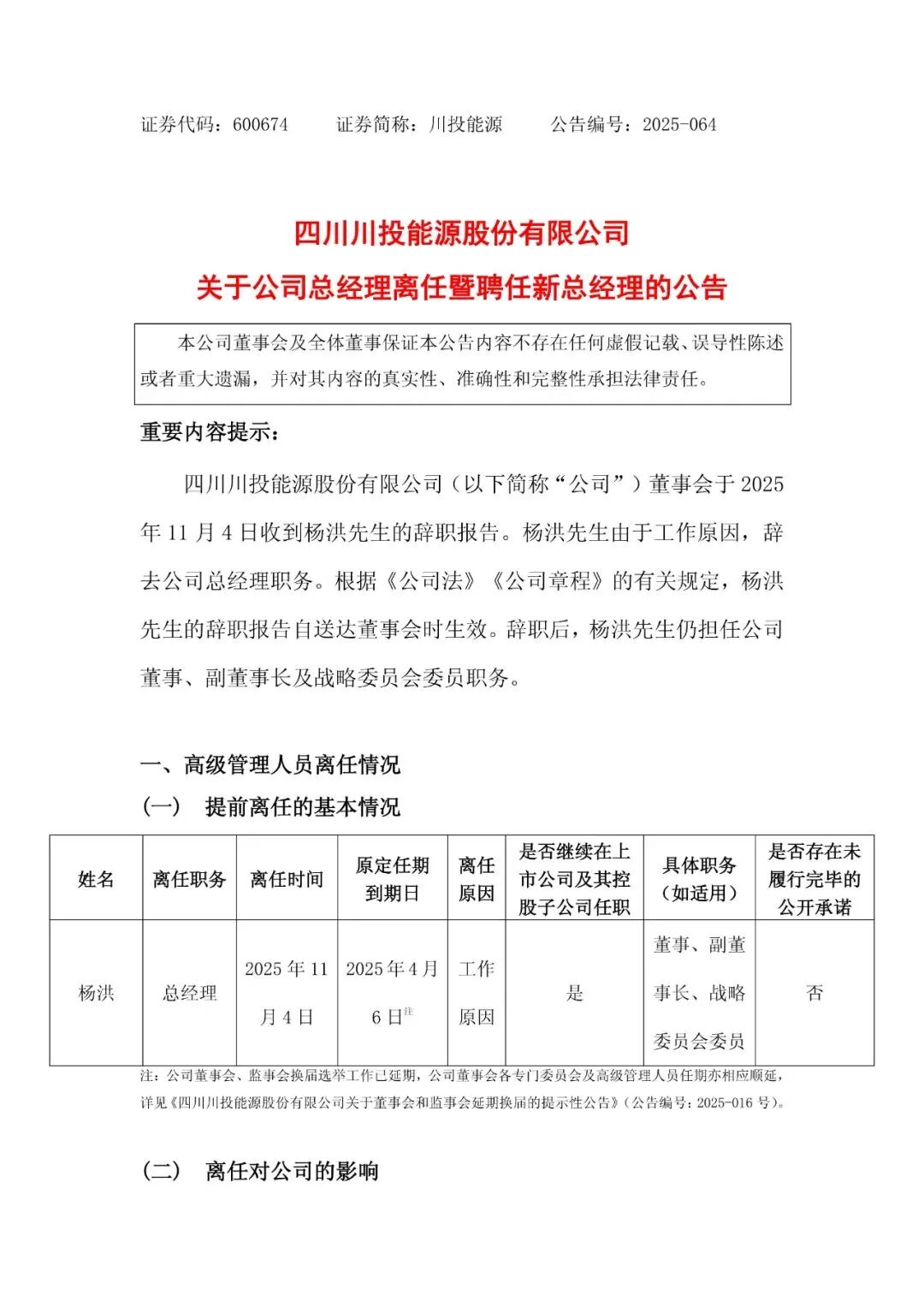 四川川投能源股份有限公司于2025年11月4日收到总经理杨洪的辞职报告,因工作原因辞去总经理职务,辞职自送达董事会时生效。杨洪辞任后仍担任公司董事、副董事长及战略委员会委员。公司于2025年11月5日召开第十一届四十二次董事会,审议通过聘任黄强为公司总经理,任期自董事会审议通过之日起至第十一届董事会任期届满之日止。
