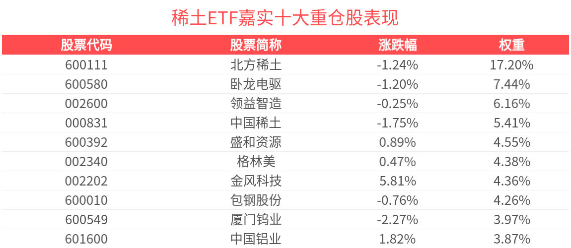 数据显示,截至2025年9月30日,中证稀土产业指数前十大权重股分别为北方稀土、卧龙电驱、领益智造、中国稀土、盛和资源、格林美、金风科技、包钢股份、厦门钨业、中国铝业,前十大权重股合计占比61.96%。
