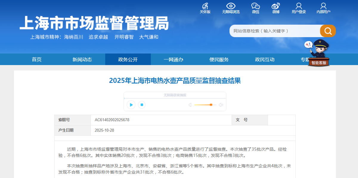 中国质量新闻网讯 近日,2025年上海市电热水壶产品质量监督抽查结果公布。