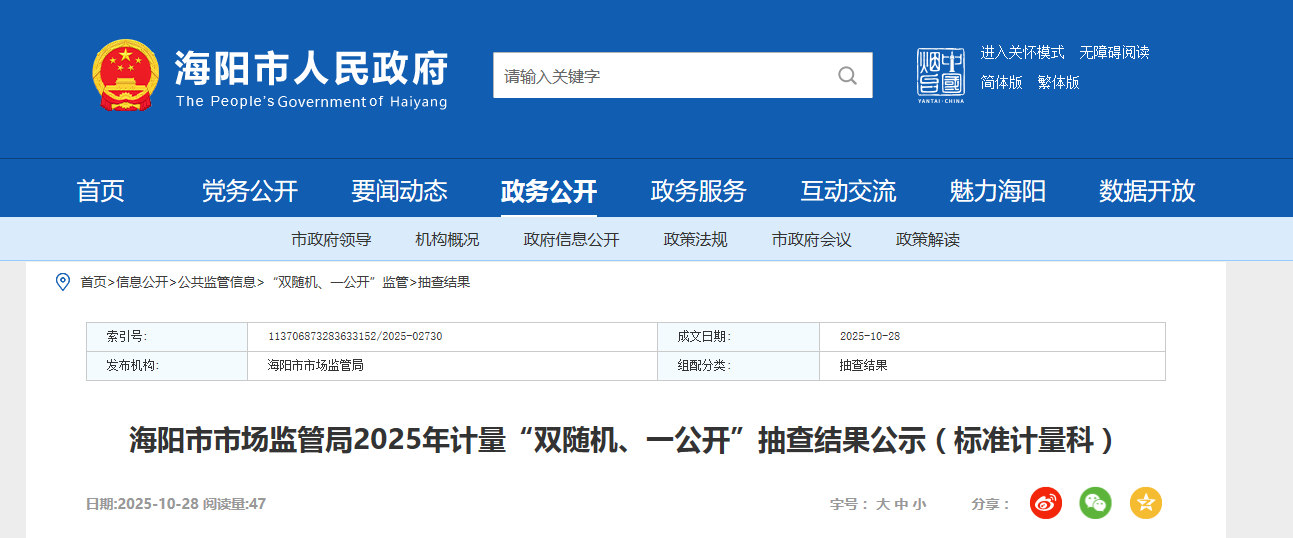 海阳市政府 抽查结果 海阳市市场监管局2025年计量“双随机、一公开”抽查结果公示(标准计量科)