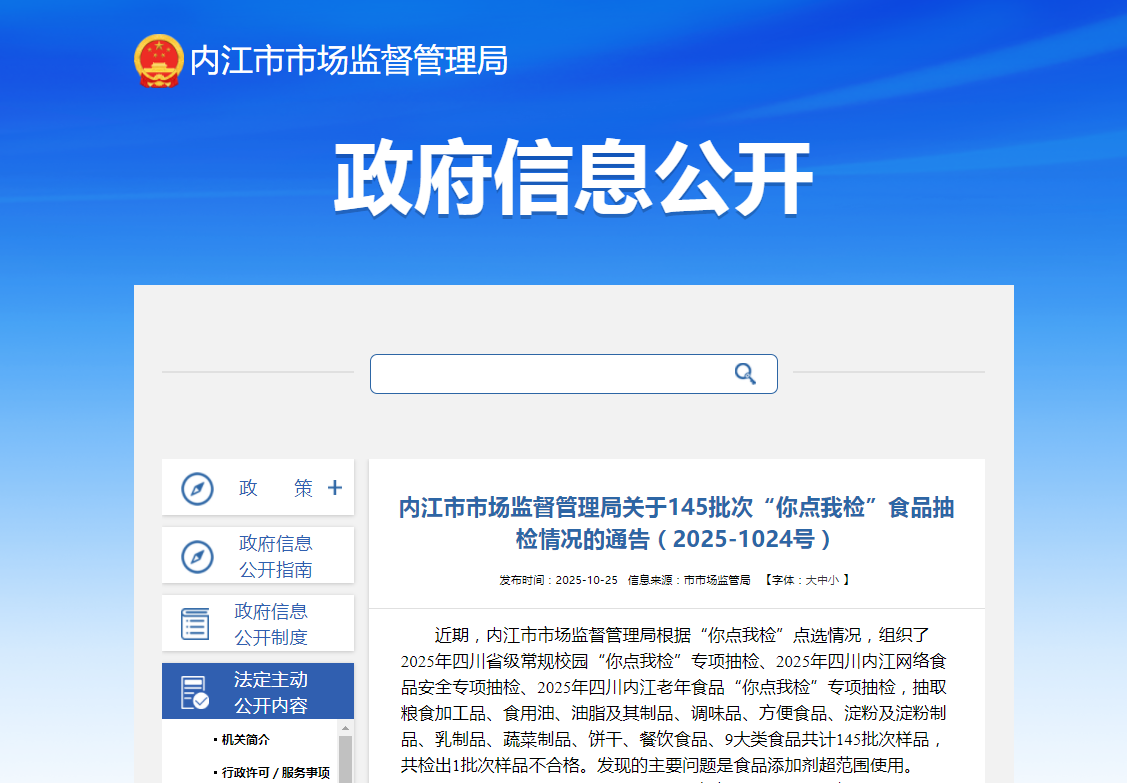 近期,内江市市场监督管理局根据“你点我检”点选情况,组织了2025年四川省级常规校园“你点我检”专项抽检、2025年四川内江网络食品安全专项抽检、2025年四川内江老年食品“你点我检”专项抽检,抽取粮食加工品、食用油、油脂及其制品、调味品、方便食品、淀粉及淀粉制品、乳制品、蔬菜制品、饼干、餐饮食品、9大类食品共计145批次样品,共检出1批次样品不合格。发现的主要问题是食品添加剂超范围使用。
